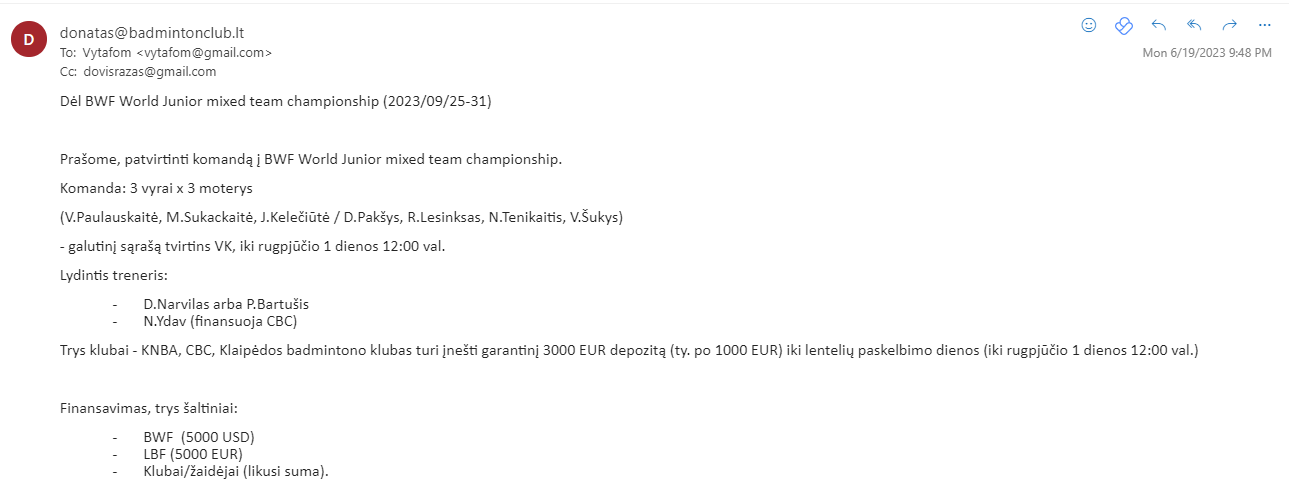 2. Dėl dalyvavimo BWF Junior World championships